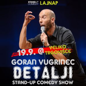 DETALJI - GORAN VUGRINEC - stand-up comedy show ŠTO SU DETALJI? Nevidljivi djelići našeg svakodnevnog bivanja zapravo su trenuci u kojima najviše uživamo. Četvrti show po redu zagrebačkog komičara Gorana Vugrineca oživljava te momente i podsjeća publiku na zaboravljene misli i anegdote koje su nas nasmijale. Podsjetnik da je ljepota života je u detaljima koji nas okružuju. A detalji mogu biti trenuci odrastanja, flashbackovi iz škole, (ne)s(p)retne ljubavi, gubljenje u tehnologiji... Goran će vas nasmijati sitnicama u kojima ćete se sigurno prepoznati. Dođi i uživaj! :) TKO JE GORAN VUGRINEC? Zagrebački komičar s 15 godina iskustva. Suosnivač i član komičarske grupe LAJNAP COMEDY. Na pozornici baca fore dobre k'o produženi vikend, a kao voditelj nasmijat će publiku i na karminama. U nastupima obuhvaća teme iz života - od svakodnevnih situacija preko ljubavnih problema i savjeta do tehnologije koja je svuda oko nas. Voli pričati i o odrastanju, roditeljima i današnjim klincima, a nisu mu strane ni pošalice o politici.